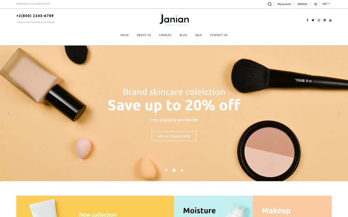 This Shopify korean cosmetics online store theme named Janian is a perfect eCommerce solution for beauty salons, and online shops to sell korean cosmetics beauty items and makeup products.