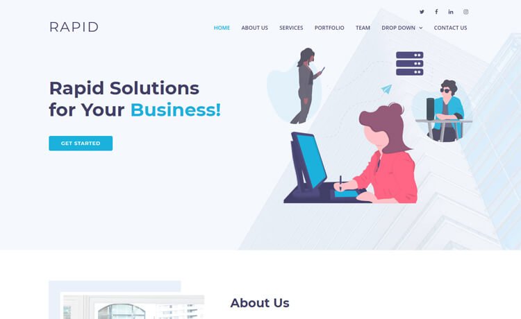 Rapid is a free Bootstrap business website template with modern and minimal web design. It is an elegant multipurpose theme which best suits business agency, startups, marketing agency, digital agency and other similar type of websites. Moreover, Rapid is a one page template with the latest web development trends and modern features.
